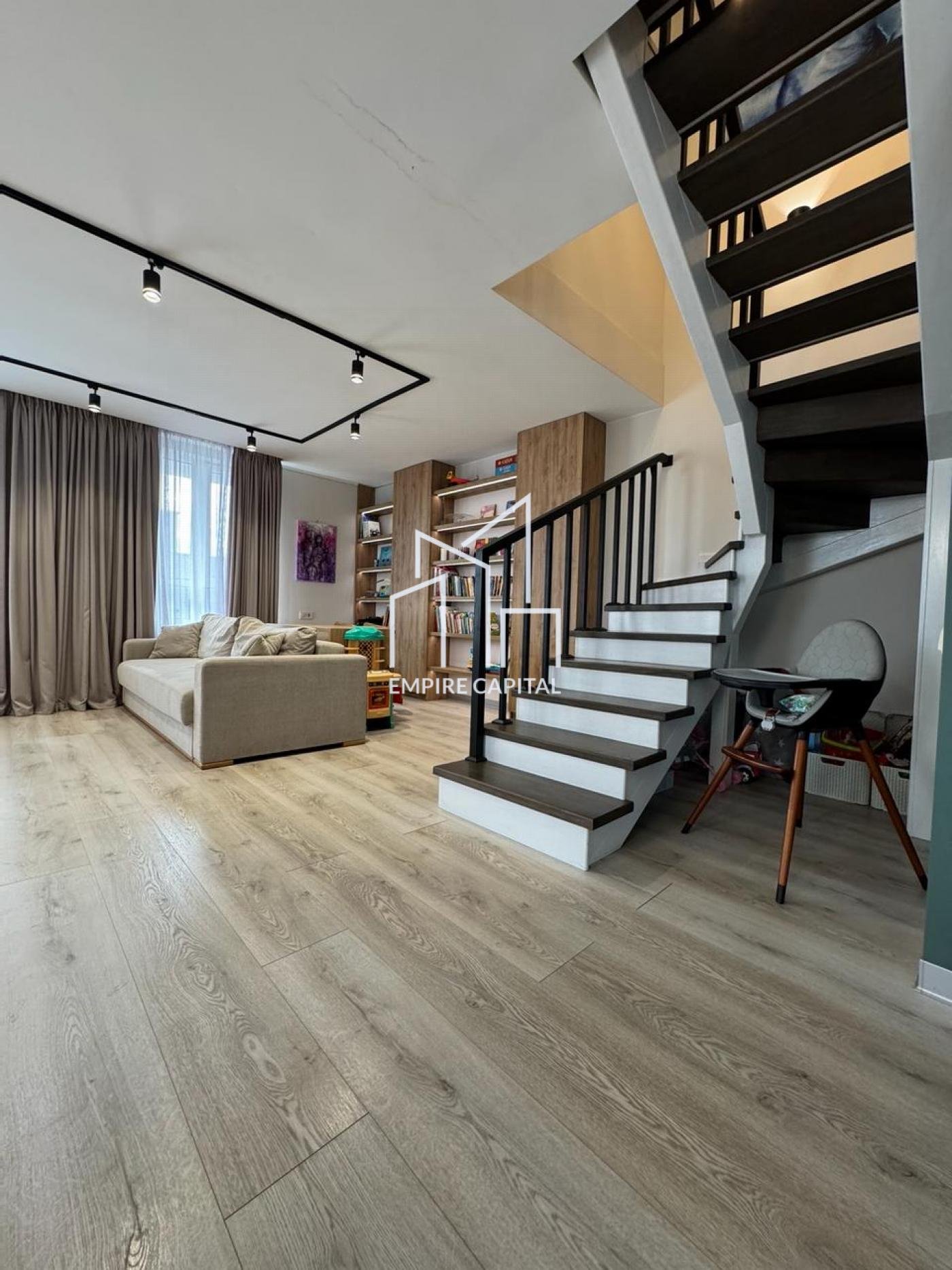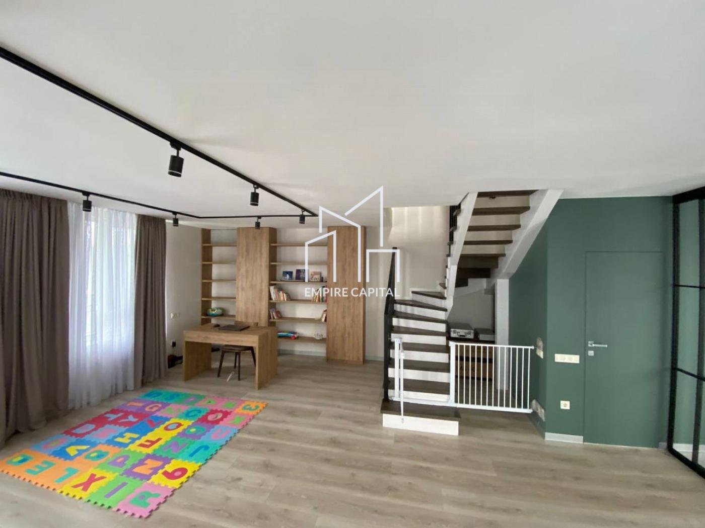 -Простора вітальня з бібліотекою та робочою зоною