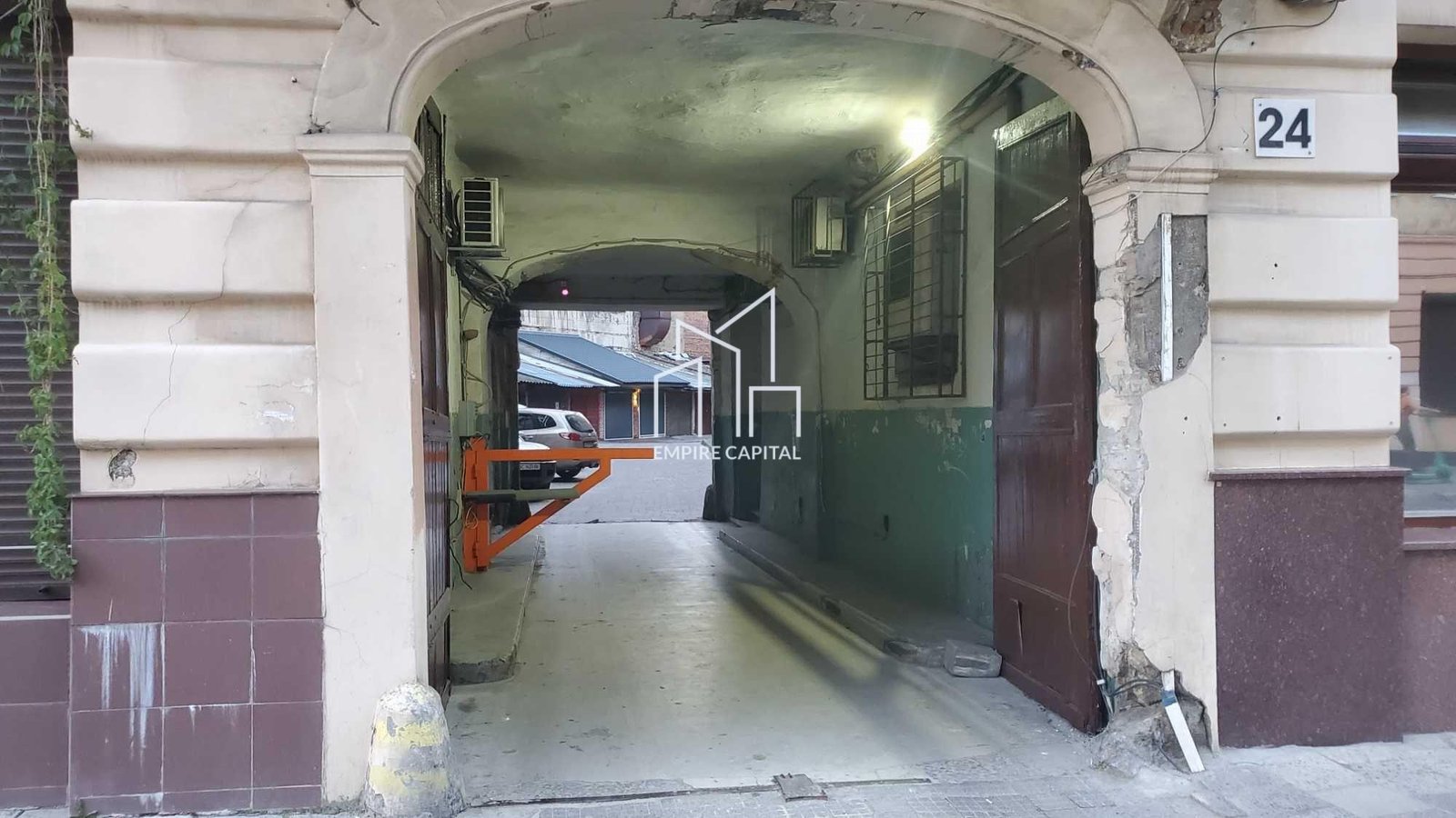 Заїзд у двір через шлагбаум на пульті. Наразі в приміщенні знаходиться кафе,яке там занаходиться чотири роки, є можливість оренди з обладнанням.