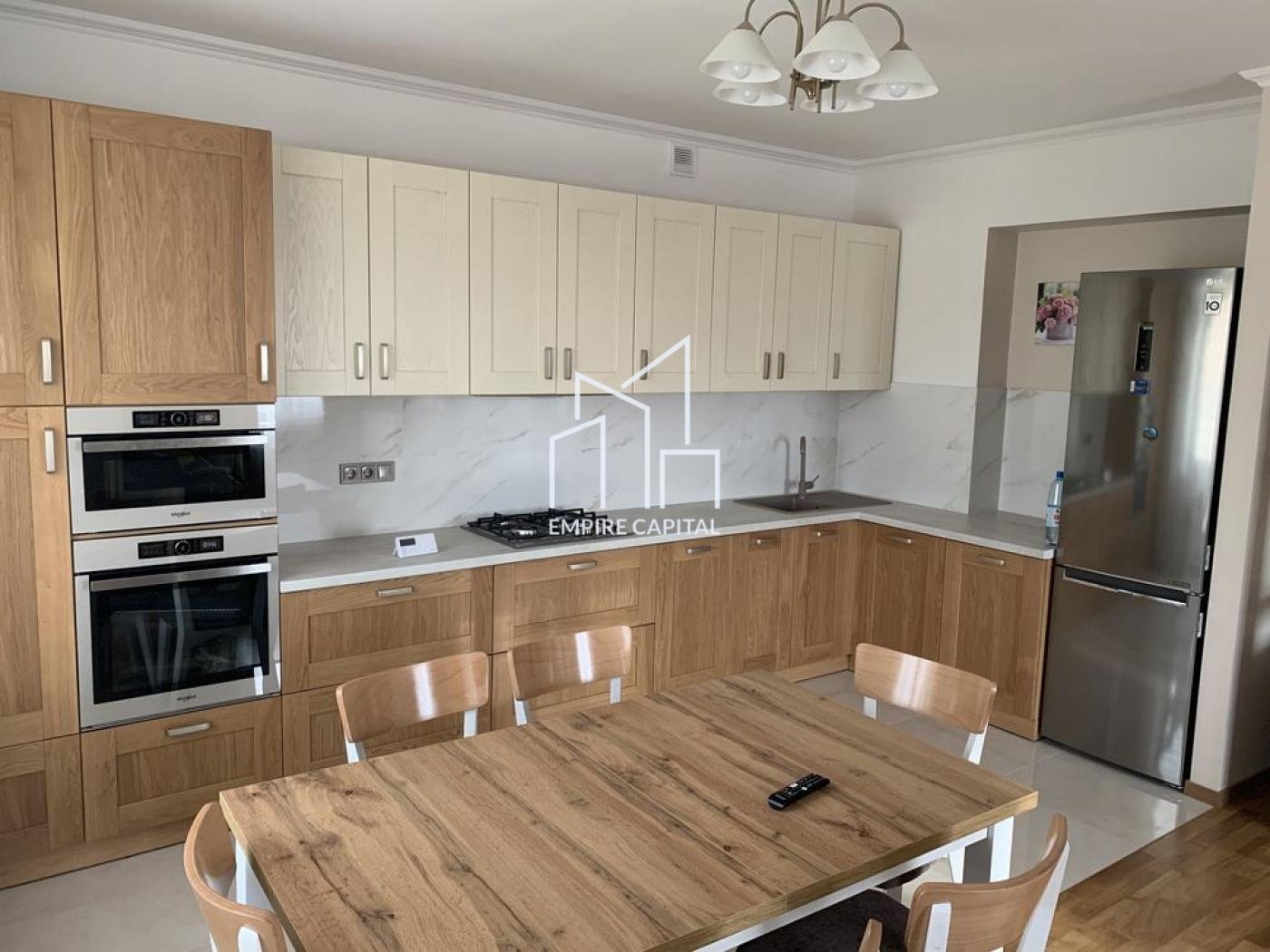 Внутрішнє обладнання: У котеджі є велика кухня-вітальня, три кімнати, два санвузли з ванною та душем, кладова. Також є нова побутова техніка, включаючи посудомийку та дві телевізійні апарати, а також двохфункційний газовий котел для опалення.
