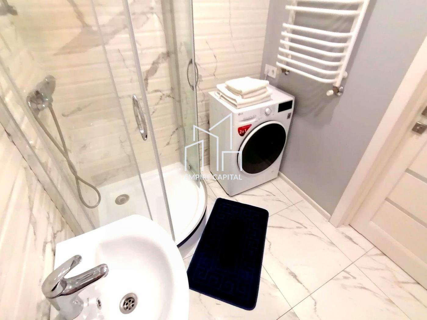 -Санвузол: умивальник, душова кабіна, унітаз, пральна машина, рушникосушка.