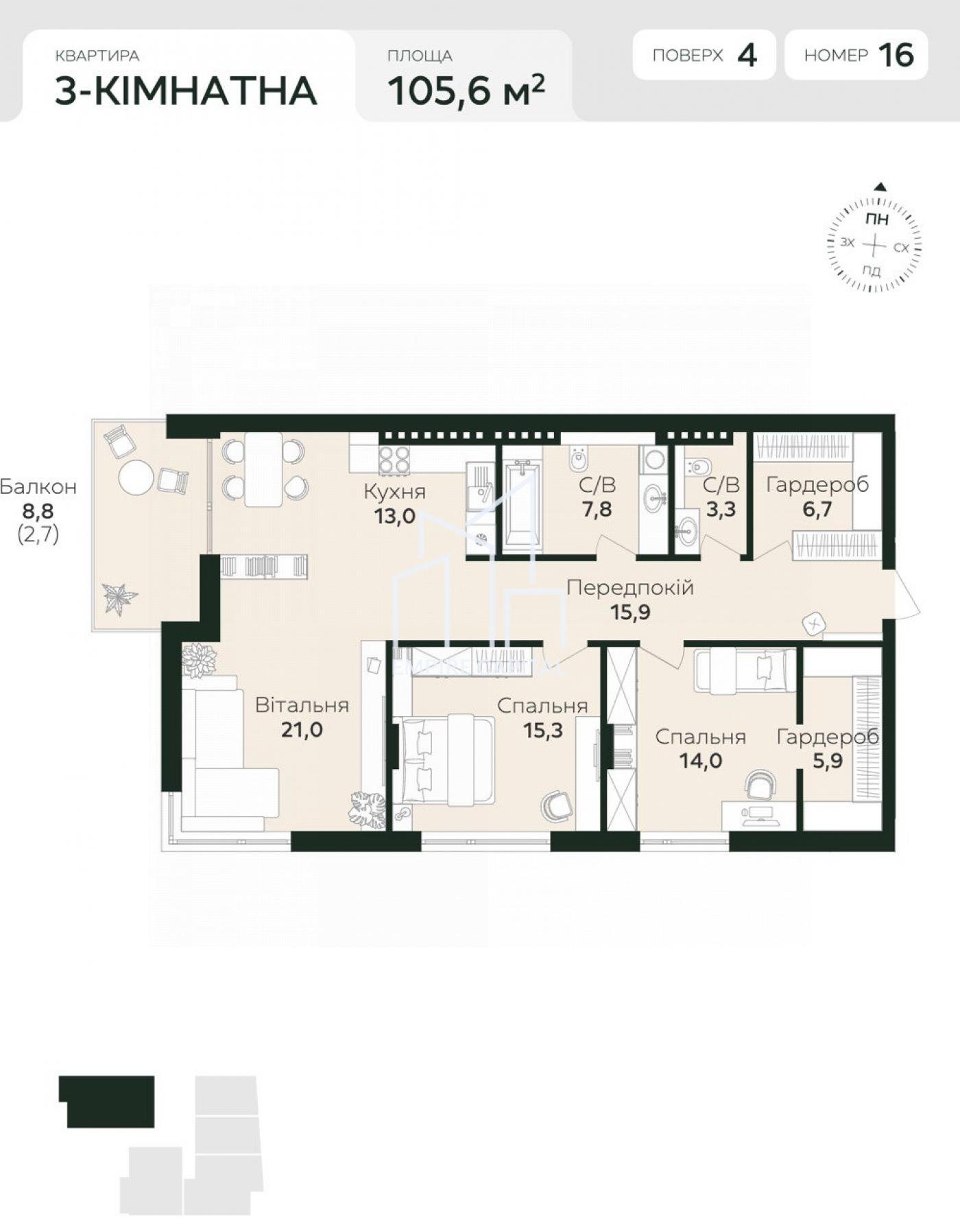-Кількість кімнат:3