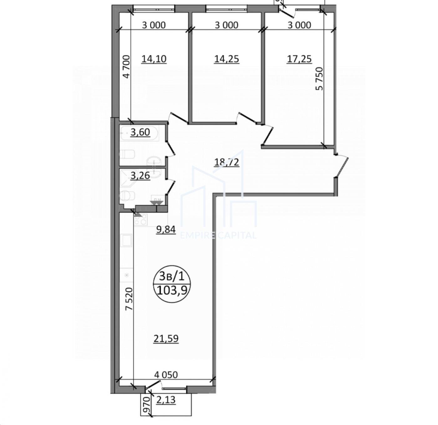 3-к з двома санвузлами та балконом | Park Side, 103 м²